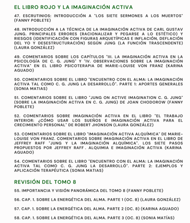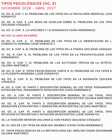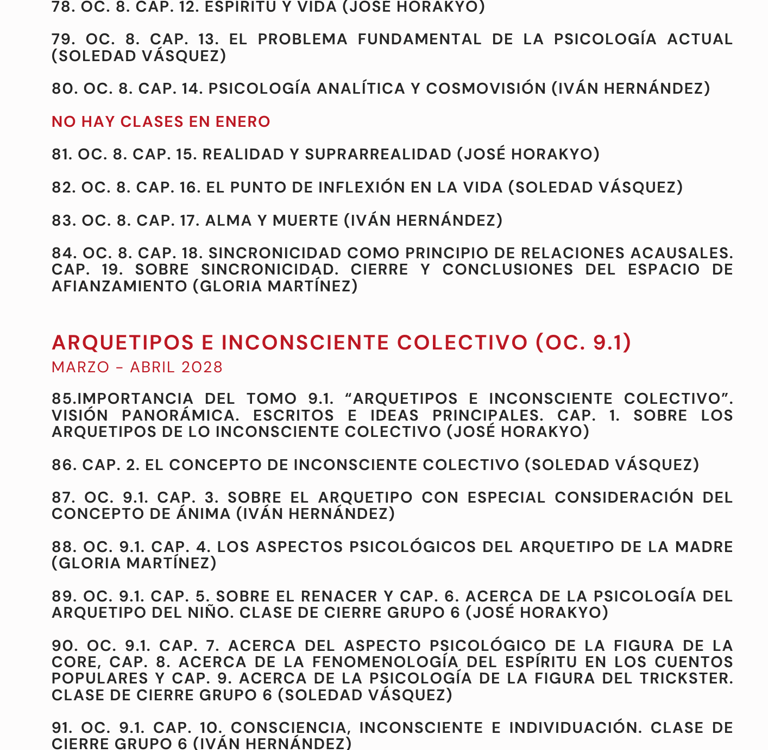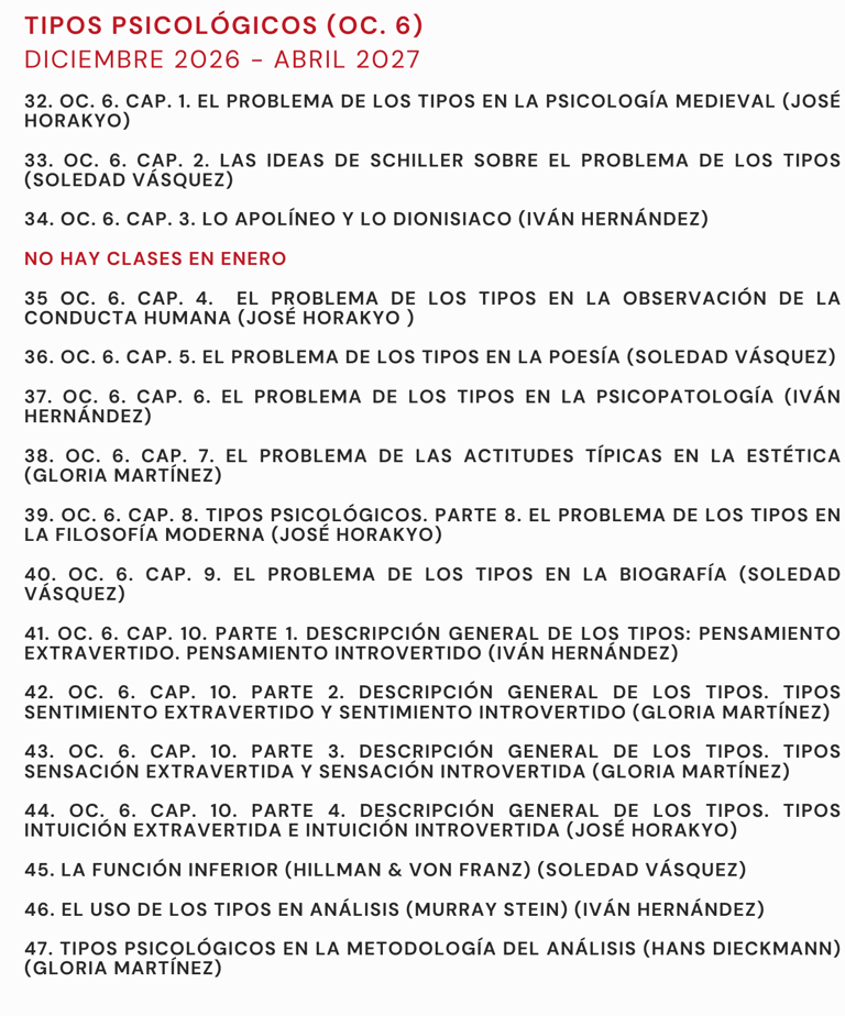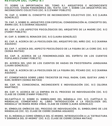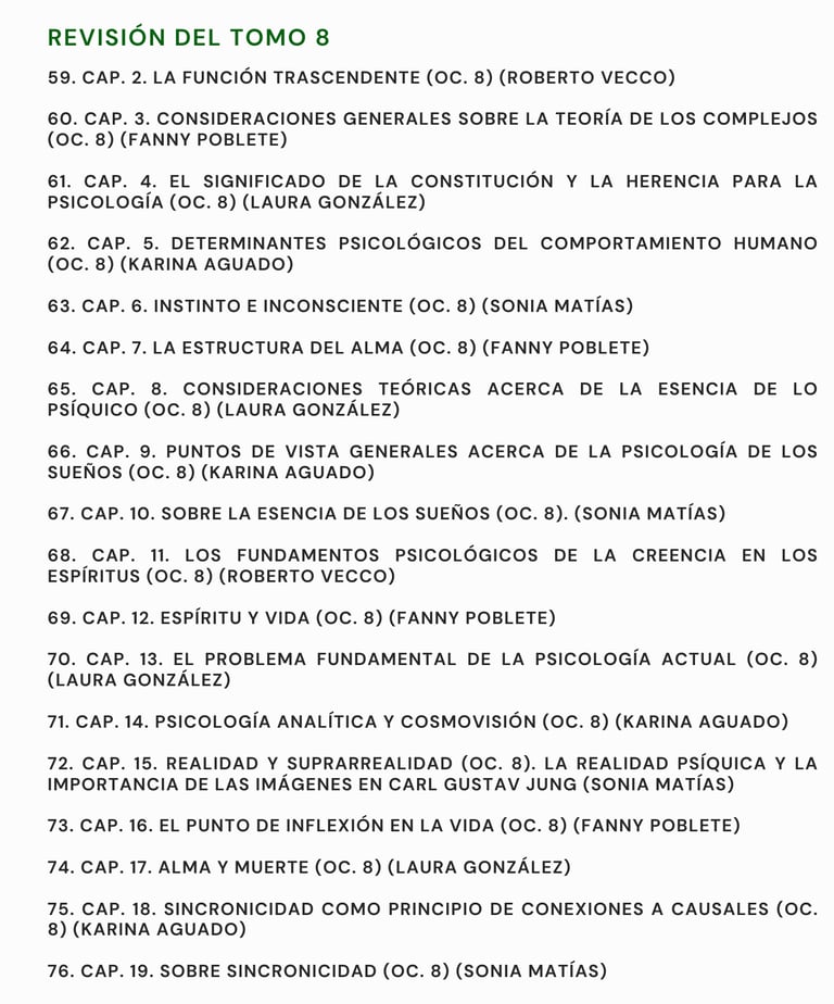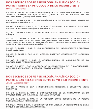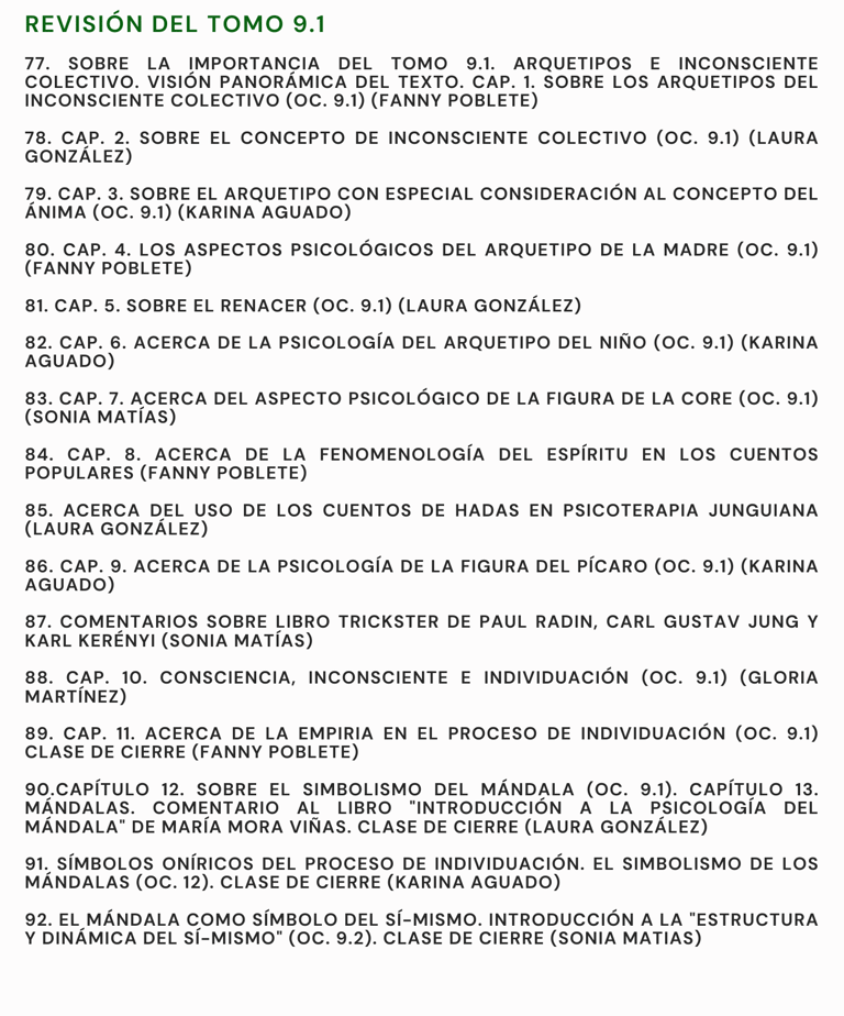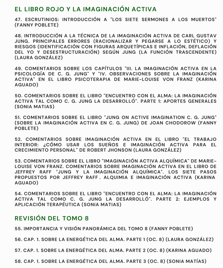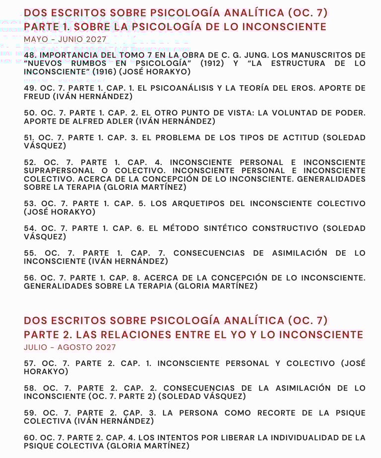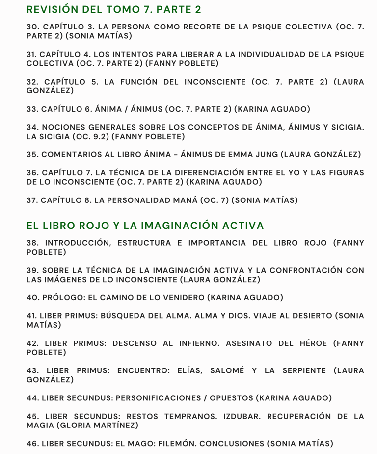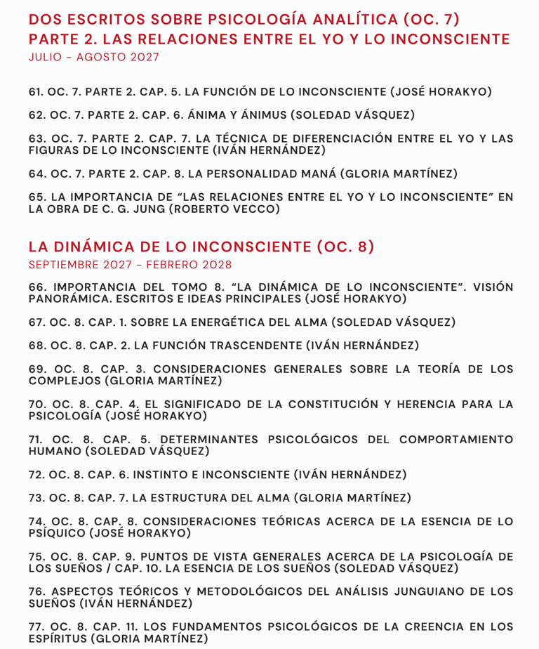 Se revisan ciclos de diversos temas y artículos de la Obra Completa Junguiana: El problema fundamental de la psicología actual, Los dos tipos de pensamiento, La Vida Simbólica, la Estructura del Alma, La Energética del Alma, Teoría General de los Complejos, Las conferencias de Tavistock, Seminario de Introducción a la Psicología Analítica, La Función Trascendente, Arquetipos e Inconsciente Colectivo, Proceso de Individuación, Sincronicidad, Psicología y Alquimia, etc.