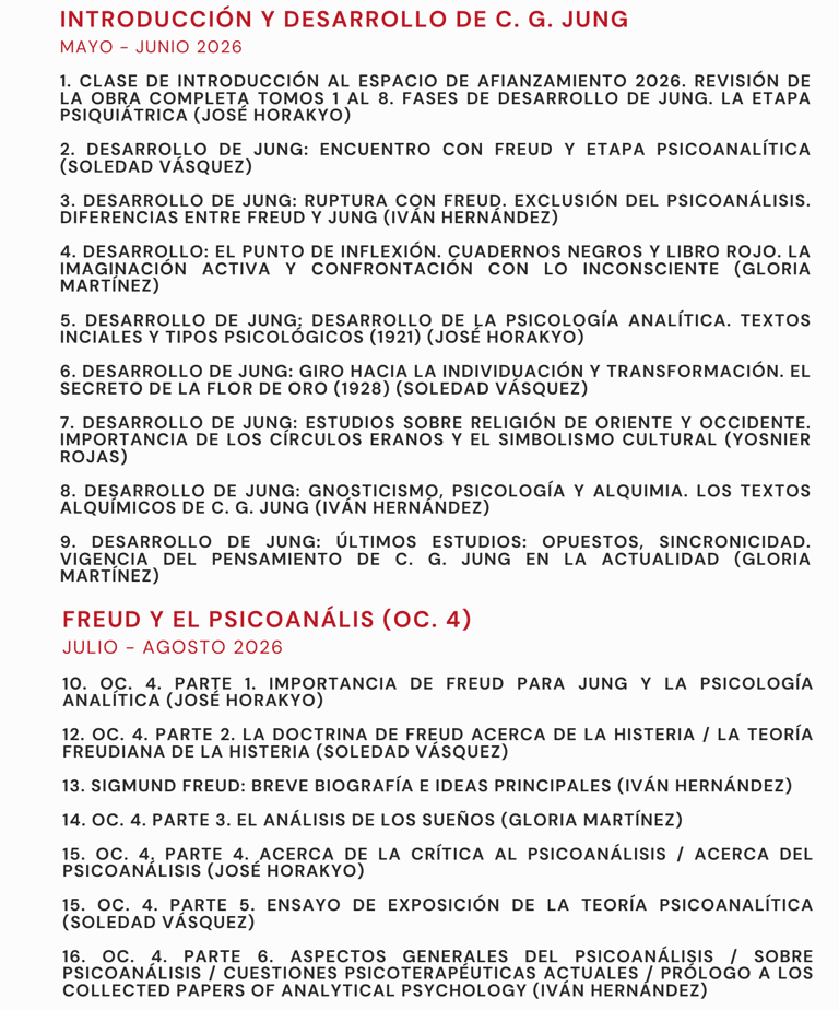 El Espacio de Afianzamiento es un espacio de central importancia en la Formación en Psicología Junguiana del Instituto Eleusis. Es un espacio creado buscando acompañar a nuestros alumnos de la mano en el estudio de la Obra Completa y Pensamiento de Carl Gustav Jung. Realizamos estas clases de manera gratuita para nuestros alumnos desde el año 2021.