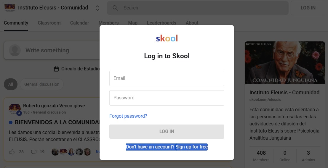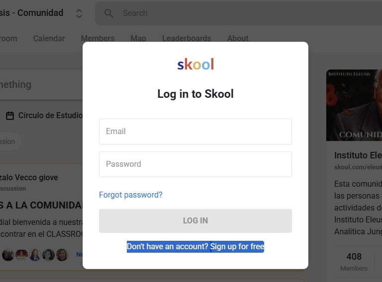 De click en LOG IN esquina superior derecha. De click en "No tengo una cuenta (Don't have an account?. Sign up for free). Si ha creado antes una cuenta en Skool y ya participa de otros grupos en esta plataforma, sólo ingrese sus datos